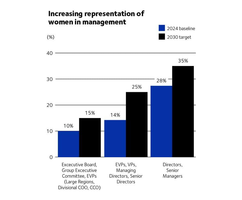The gender composition of our Executive Management, comprising the Executive Board, Group Executive Committee and Executive Vice Presidents, is unchanged from last year, characterised by a low female representation. To promote equal gender distribution at the highest management levels, DSV set global 2030 targets in 2024 for women in senior management positions.